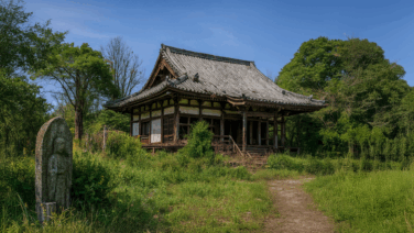 山奥にひっそりと残された廃寺と石仏を描いた背景素材。怪談朗読、事件解説、都市伝説、心霊動画などに最適。