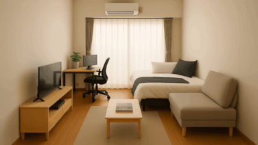 若い男性が暮らす整ったワンルームを描いた背景素材。事件解説、都市伝説、怪談朗読、行方不明の再現映像などに最適。