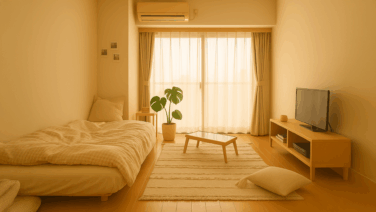 若い女性が暮らす整ったワンルームを描いた背景素材。事件解説、都市伝説、怪談朗読、行方不明の再現映像などに最適。