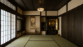 遺影や仏壇が残された廃屋の和室を描いた背景素材です。