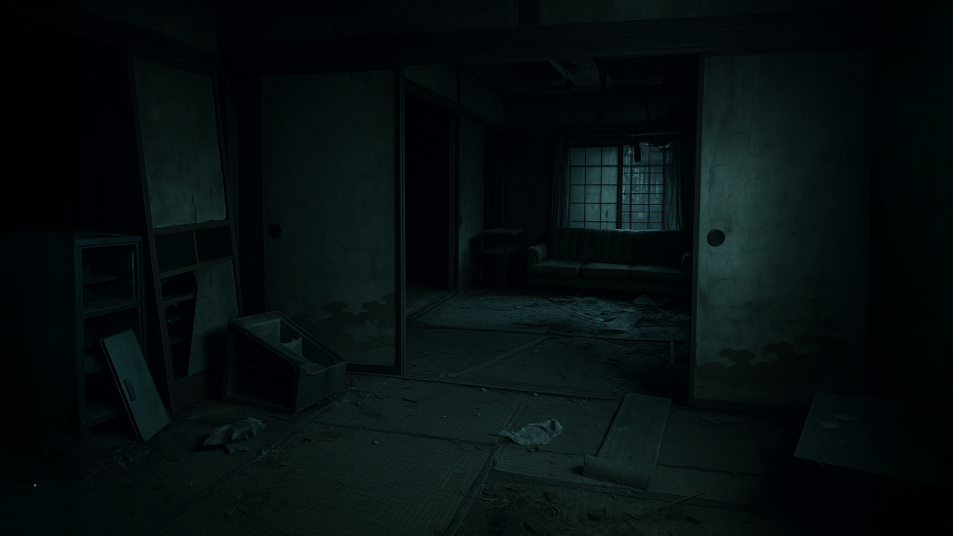 人の気配を失った廃屋の和室を描いた背景素材です。畳や障子、古びた家具が残る薄暗い空間は、怪談朗読、事件解説、都市伝説、心霊動画などに最適。